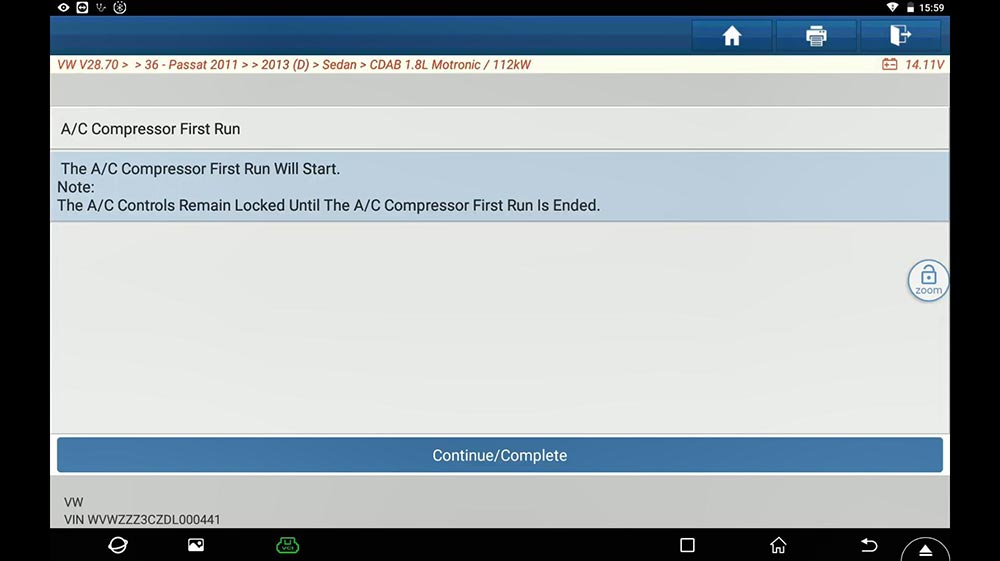 Press “Continue /Complete” to perform A /C Compressor First Run.